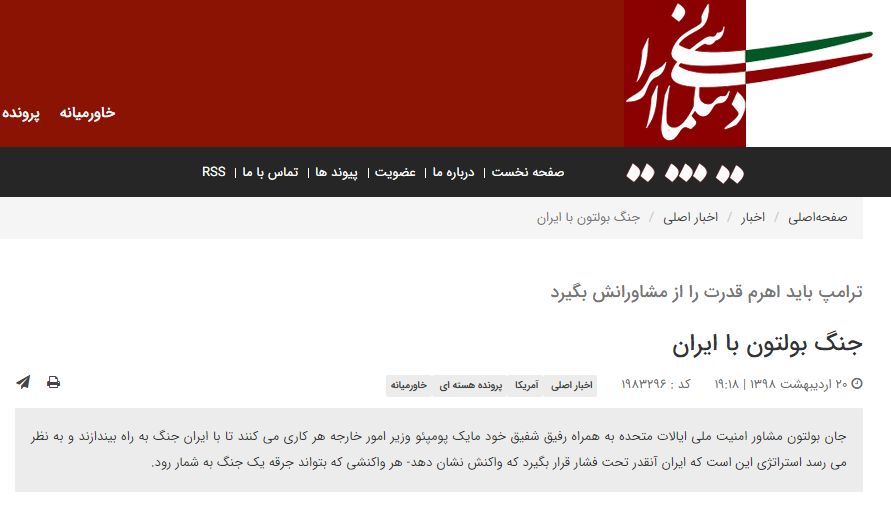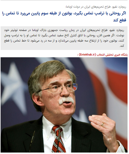 رسانه های داخلی حامی دولت در اقدامی عجیب و آشکار به این مواضع دامن می زنند. یکی از رسانه های وابسته به دولت با انتشار سخنان معمار تحریم های آمریکا بر بازی بولتونِ دیوانه را پوشش میدهد: «اگر روحانی همین الان به درخواست ترامپ پاسخ مثبت بدهد و به کاخسفید زنگ بزند و بگويد وصل کنید دفتر ریس جمهوری، جانبولتون ولو با پرواز از پله هاي سه طبقه كاخ سفيد ، خود را به سرعت مي رساند تا دستش را روي تلفن بگذارد و تماس را قطع كند.»