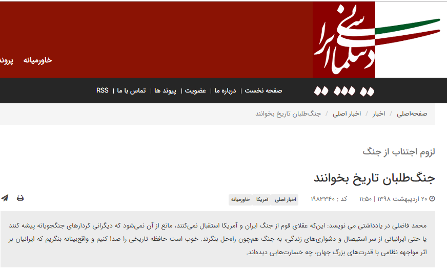 یکی از ابزارهای پروپاگاندای اصلاحطلبان در مطلبی با عنوان« لزوم اجتناب از جنگ، جنگ طلبان تاریخ بخوانند» ایران را شکست خورده قطعی در نبرد با ابرقدرت ها معرفی می کند و برای اثبات این ادعا حتی ایران کنونی را با ایران دوره قاجار و پهلوی مقایسه میکند! این رسانه در مطالب متعدد سعی دارد تا شبح جنگ بر سر ایران را بسیار بزرگ نشان دهد.